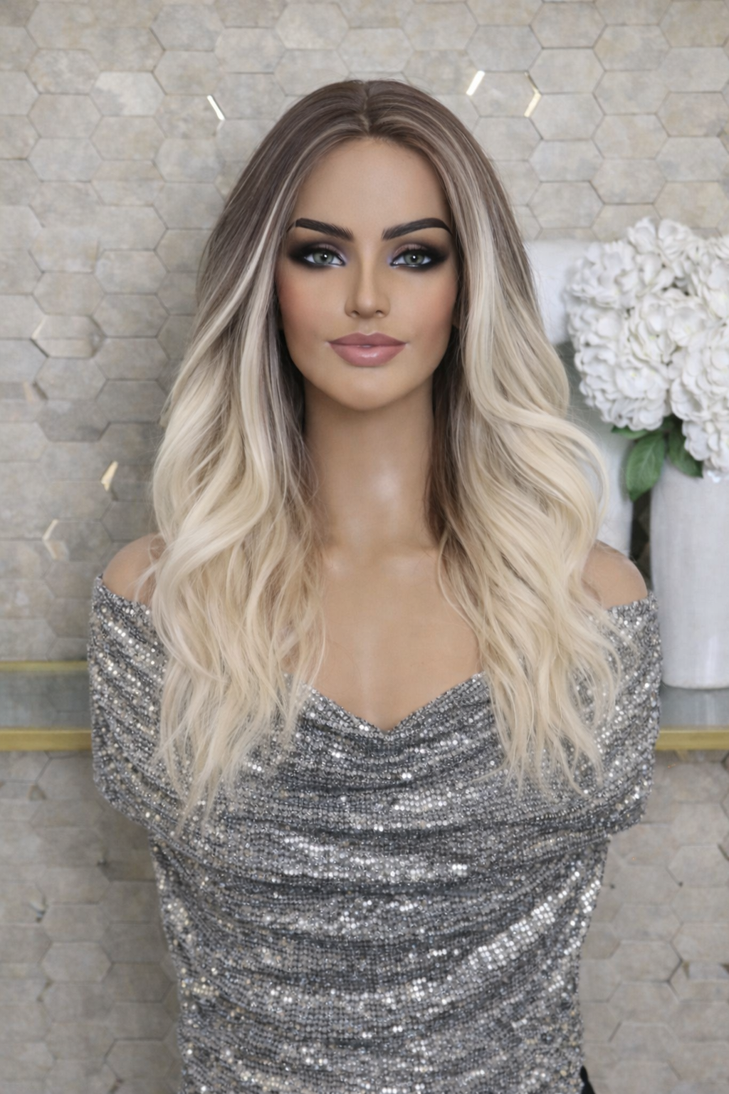 Peruca are o nuanță ombre elegant, cu rădăcini șaten deschis bej care se estompează treptat într-un blond perlat luminos, creând o tranziție naturală și sofisticată. Jocul de tonuri reci și calde oferă profunzime și un efect vizual rafinat, potrivit oricărui tip de ten.